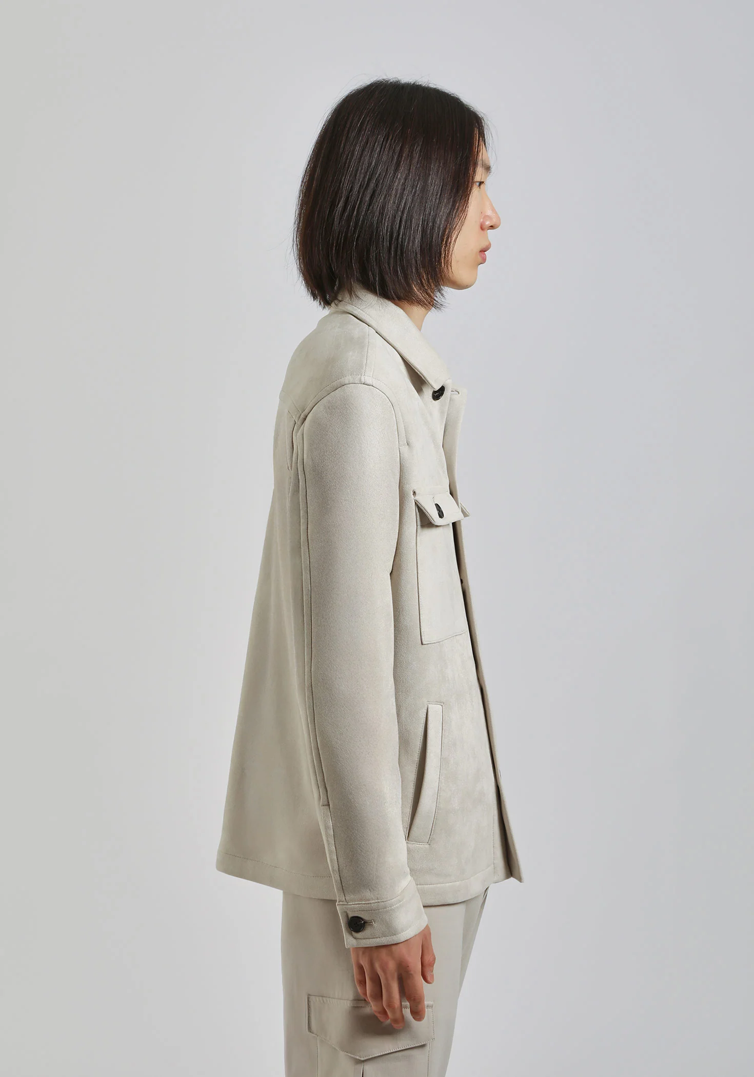 ALTEZZA MODELLO 185cm - TAGLIA L Giacca camicia effetto camoscio con chiusura con bottoni. Due tasconi anteriori sul petto e due tasche laterali.