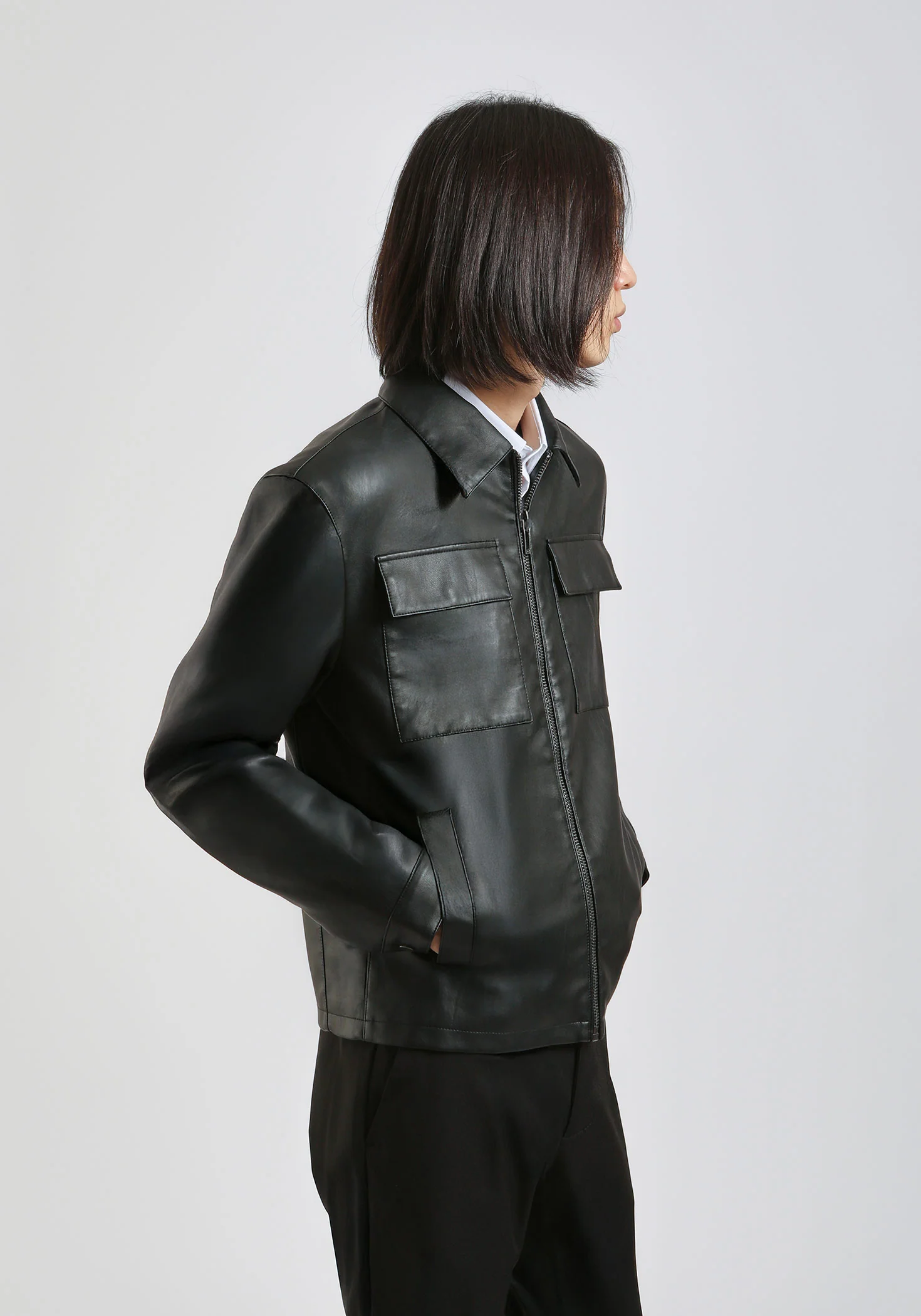 ALTEZZA MODELLO 185cm - TAGLIA L Giacca camicia effetto pelle con chiusura con zip. Tasche laterali e tasconi sul petto.