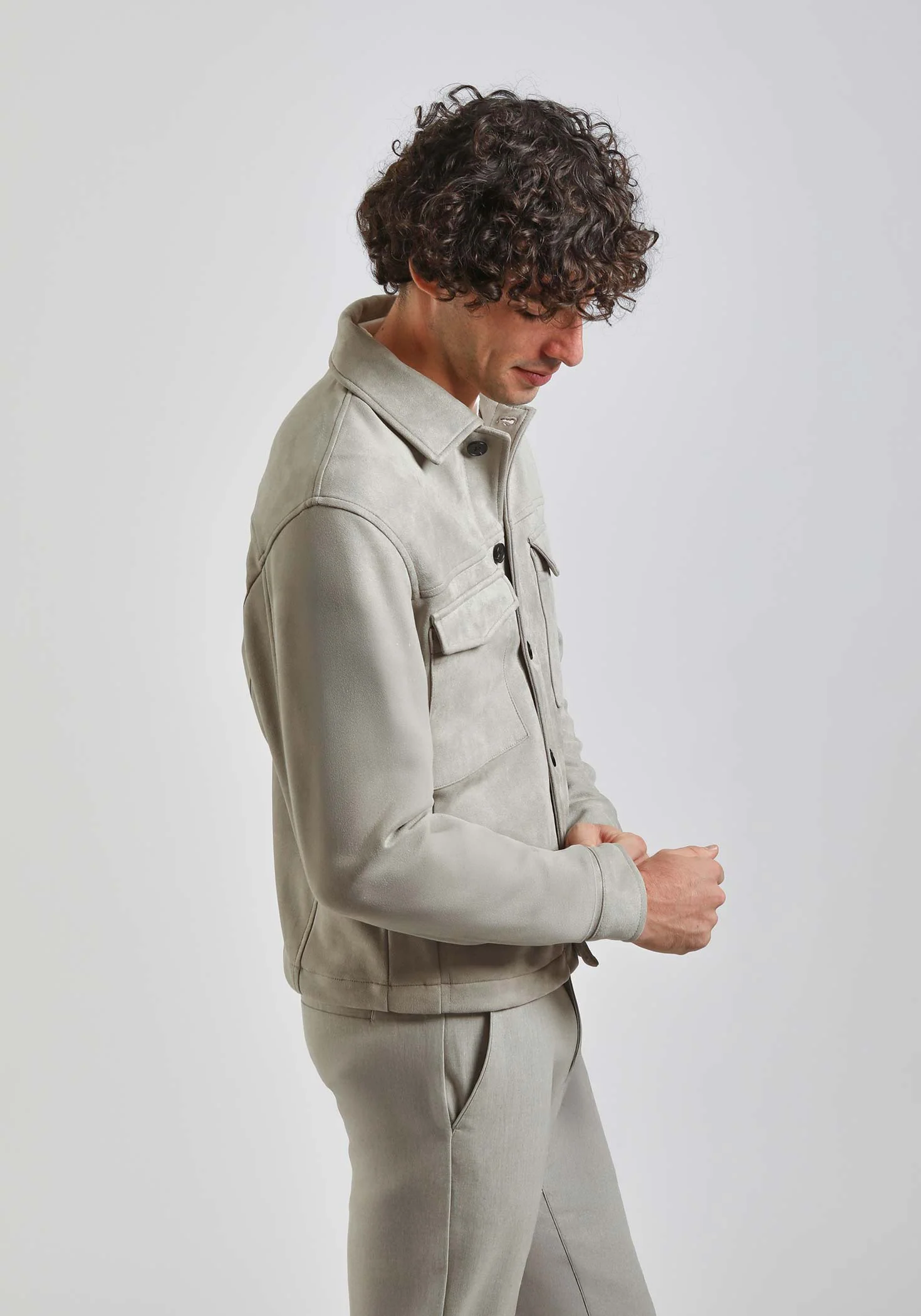 ALTEZZA MODELLO 185cm - TAGLIA L Giacca camicia effetto camoscio con chiusura con bottoni a contrasto. Due tasconi anteriori sul petto e due tasche laterali.